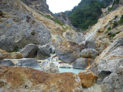 そんな中にぽつんとある白濁したお湯はちょっと熱めも心地よい湯。野趣溢れる風呂に本当に感動! 温泉好きの人間にはたまらない場所だと思います。気温も下界は30度近くありましたが、標高1300メートルの当所は約21~2度で風が吹けばちょっと寒く感じるくらいのところ。湯に浸かっては出て、また湯に浸かるといった事を繰り返して温泉を十二分に楽しみました。